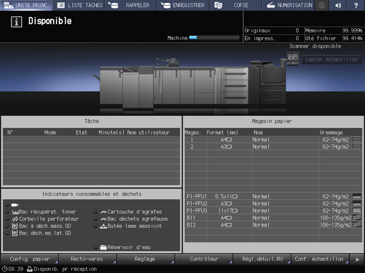 Vérifiez le réglage papier de chaque magasin affiché sous Papier.