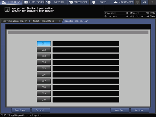 Sélectionnez le numéro d'enregistrement souhaité, puis appuyez sur OK. La liste affichée sur l'écran Liste réglage couleur par type papier indique les valeurs de réglage des couleurs pour chaque type de papier qui sont enregistrées dans Contrôle densité couleur sur l'écran Menu de réglage.