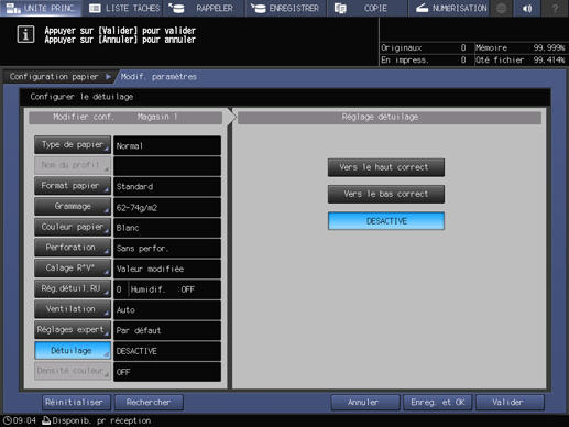 Explication supplémentaireLe réglage Humidificateur n'est affiché que si l'humidificateur HM-103 est installé sur la machine.