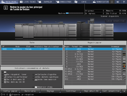 A ce stade, le message Retirer le papier du bac principal de l'unité de finition apparaît dans la zone de message de l'écran et la LED départ devient orange. La machine ne peut pas reprendre l'impression même en appuyant sur le bouton Départ du panneau de contrôle.