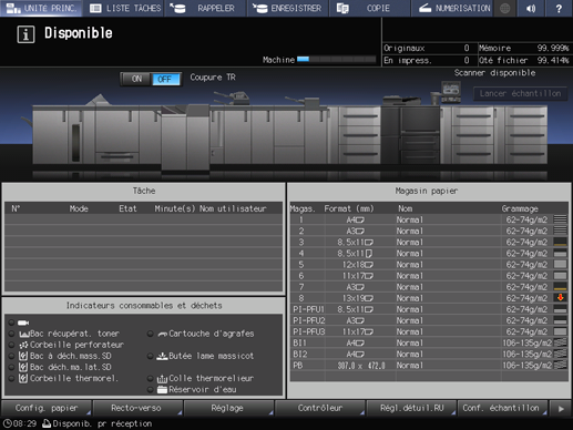 Lorsque Thermorelieur est sélectionné dans Config. sortie ou en cas de réception d'une tâche d'impression pour thermoreliure, le chauffage du thermorelieur démarre automatiquement.