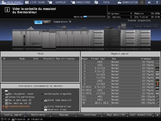 1. Appuyez sur l'indicateur Corbeille thermorel. dans la zone Indicateurs consommables et déchets de l'écran UNITÉ PRINC.