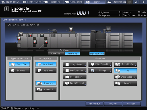 Si la machine comprend deux unités d'empileur grande capacité LS-506, EmpileurAuto est affiché sur l'écran Réglage sortie. Si la touche EmpileurAuto est pressée, la machine traite les feuilles de sortie comme suit (en supposant que l'empileur côté droit des deux empileurs grande capacité est l'empileur 1 et l'autre du côté gauche est l'empileur 2) :