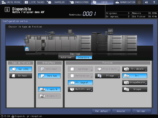 L'image frontale de la machine représentée sur l'écran Réglage sortie montre que le bac pliage est le bac de sortie sélectionné.