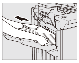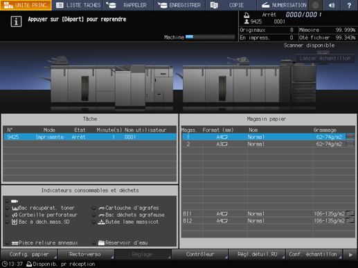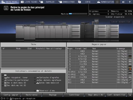 A ce stade, le message Retirer le papier du bac principal de l'unité de finition apparaît dans la zone de message de l'écran et la LED départ devient orange. La machine ne peut pas reprendre l'impression même en appuyant sur le bouton Départ du panneau de contrôle.