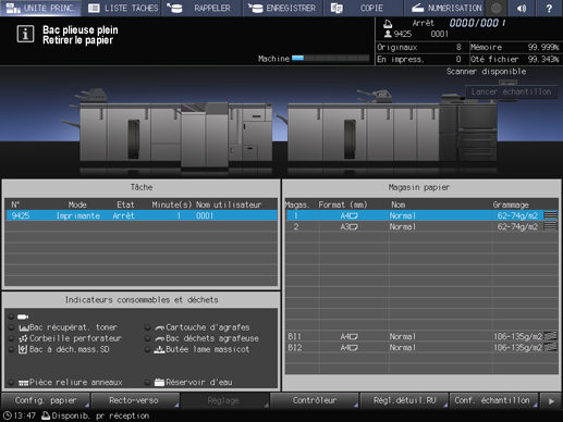 Si la capacité du bac de pliage est dépassée, la machine s'arrête automatiquement d'imprimer.