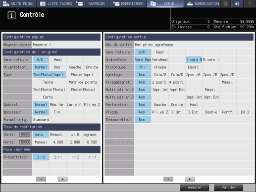 Avant de démarrer l'impression, affichez l'écran Contrôle et vérifiez les conditions de copie spécifiées. C'est un moyen commode et économique de réaliser un grand nombre de copies.