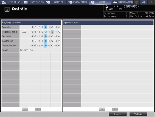 Explication supplémentaireLes paramètres actuels de Conf.papier, Configuration de l'original, Taux de restitution, Face imprimée et Réglage qualité sont affichés dans la partie gauche de l'écran Contrôle. Pour alterner l'affichage, appuyez sur ou right en bas de l'écran.
