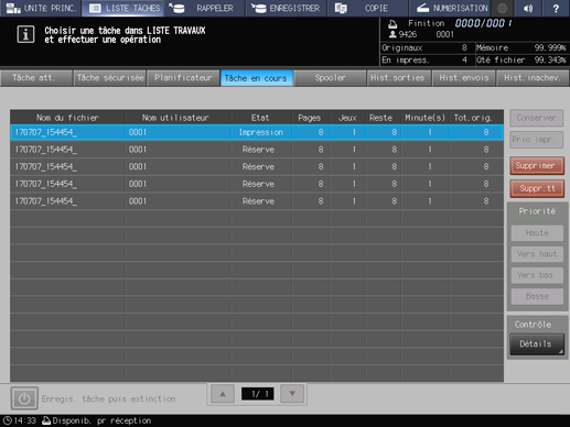 Explication supplémentairePendant la copie d'interruption, la tâche d’interruption s'affiche en haut de la liste En impression de l'écran LISTE TÂCHES.