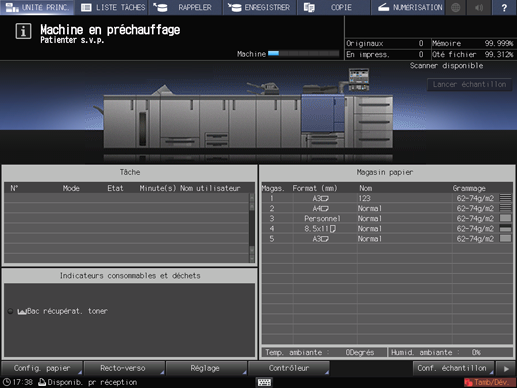 Appuyez sur l'onglet COPIE pour afficher l'écran COPIE. Vérifiez que le message Disponible pour tâche suivante est affiché.
