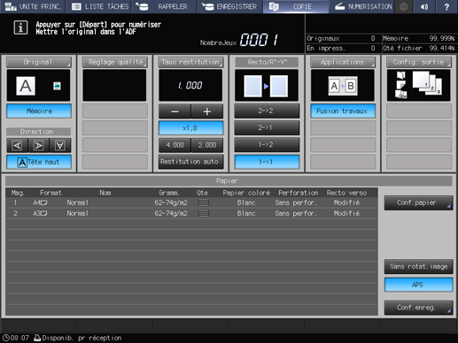 L'icône Fusion tâches et la touche de raccourci sont affichées sous l'onglet Application sur l'écran COPIE. La fonction [Mémoire] est sélectionnée automatiquement.