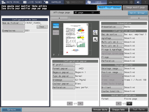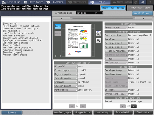 Lorsque vous changez de mode de sortie ou modifiez le nombre de copies après la fin de la numérisation, appuyez sur Contrôle sur le panneau de contrôle pour afficher l'écran Modifier fusion tâches.