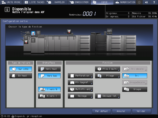 Appuyez sur Valider sur l'écran Réglage sortie pour revenir à l'écran COPIE.