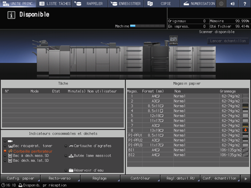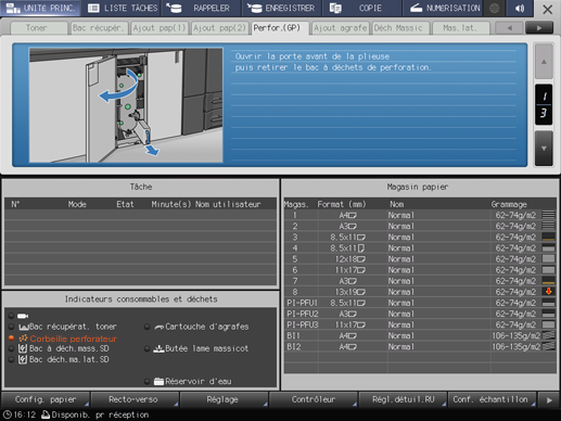 Appuyez sur l'indicateur de la corbeille perforateur dans la zone des indicateurs des consommables et des déchets de l'écran UNITÉ PRINC.