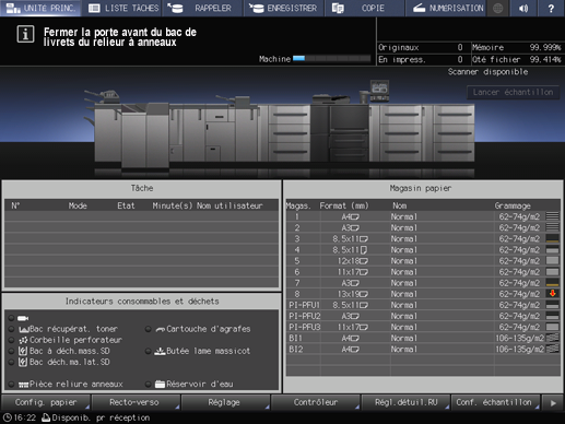 Si le bac Livret n'est pas remis en place correctement, le message Fermer la porte avant du bac Livret du relieur à anneaux s'affiche dans la zone de message de l'écran.