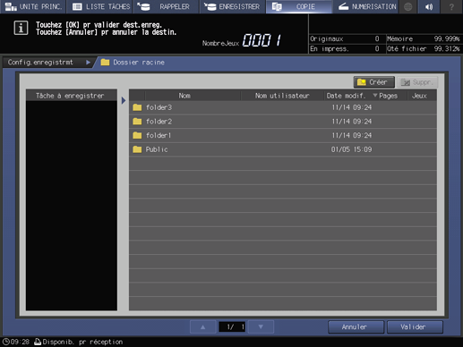 Sélectionnez Enreg.sur HDD+impress° ou Enregistrer sur HDD pour afficher l'écran Dossier racine, puis spécifiez l'emplacement d'enregistrement d'une tâche enregistrée sur DD.