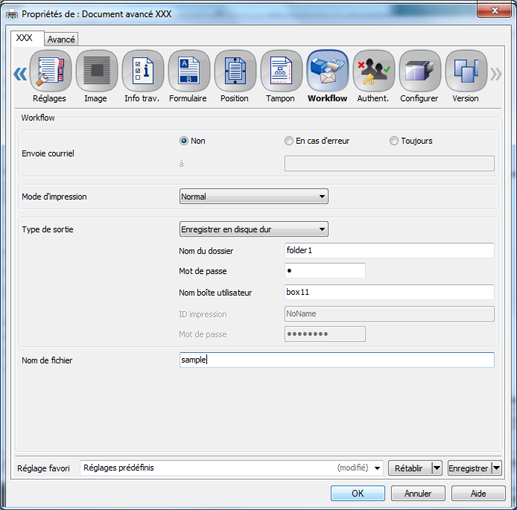 Pour enregistrer un travail d'impression sur le disque dur, entrez le Nom du dossier et le Mot de passe que vous avez spécifiés sur l'écran RAPPELER de la machine. Pour enregistrer un travail d'impression dans la boîte du dossier, spécifiez Nom boîte. Entrez le Nom du dossier et le Mot de passe pour Type de sortie. Au besoin, remplissez le champ Nom boîte utilisateur.
