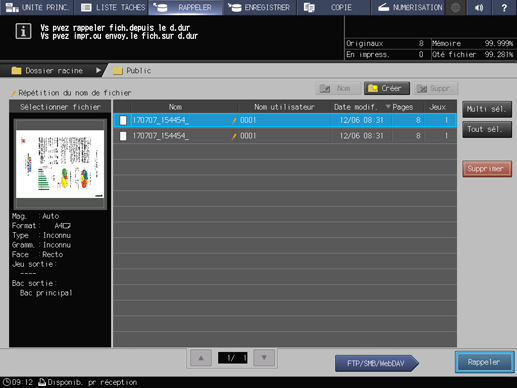 Appuyez sur l'onglet RAPPELER de l'écran tactile de la machine.