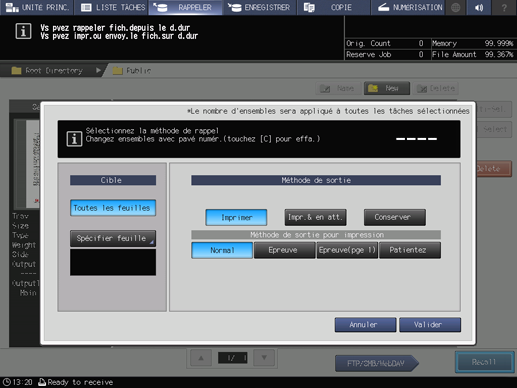 Explication supplémentaireLe nombre de jeux spécifié pour la tâche s’affiche mais vous pouvez néanmoins modifier ce nombre pour la sortie. Même si le nombre est modifié ici, le nombre initial de copies spécifié pour la tâche archivée sur le disque dur reste inchangé.