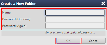 Explication supplémentaireEntrez le nom dans Nom sur l'écran Créer un nouveau dossier. Entrez le mot de passe sous Mot de passe si besoin. Cliquez sur OK pour afficher le dossier créé dans l'arborescence à gauche.