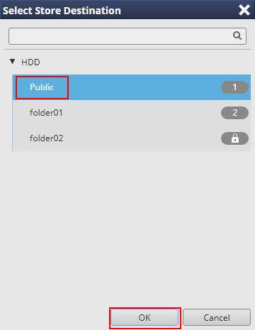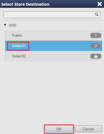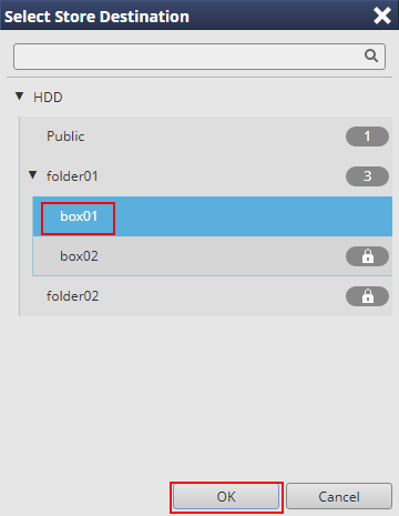 Explication supplémentairePour enregistrer une tâche dans une boîte (troisième niveau) sur le disque dur, sélectionnez une boîte dans l'arborescence de l'écran Sélectionner destination d'enregistrement, puis cliquez sur OK.