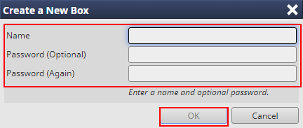 Explication supplémentaireEntrez le nom dans Nom sur l'écran Créer une nouvelle boîte. Entrez le mot de passe sous Mot de passe si besoin. Cliquez sur OK pour afficher la boîte créée dans l'arborescence à gauche.