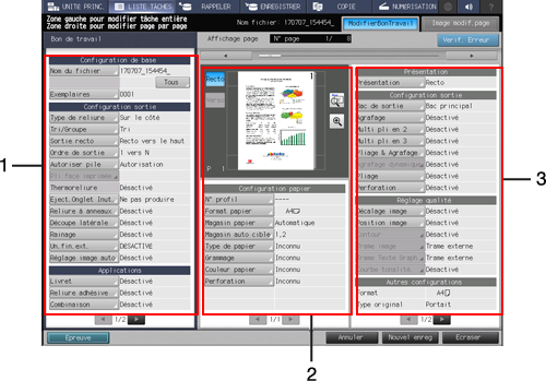 2. Volet central de l'écran | Affichage image d'aperçu | Affiche l'image d'aperçu du fichier sélectionné. Vous pouvez afficher un aperçu de l'image recto et verso d'un original 2 faces et vérifier l'image de rotation page ou le sens de sortie de l'image. Sur l'écran de prévisualisation, vous pouvez définir les repères cadrage, la position d'image ou la fonction Décalage d'image. |