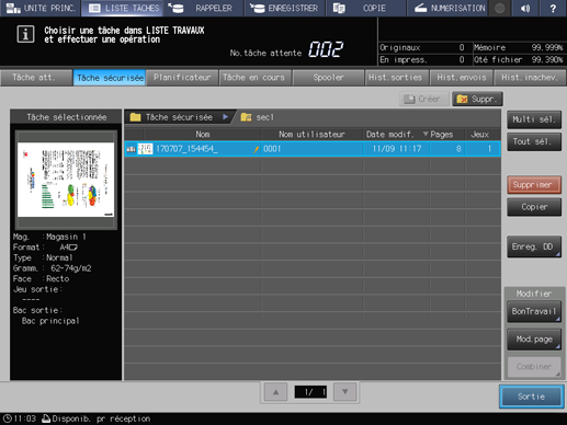 Explication supplémentaireLes tâches sécurisées sont automatiquement supprimées après impression. Le travail d'impression modifié n'est pas sauvegardé.