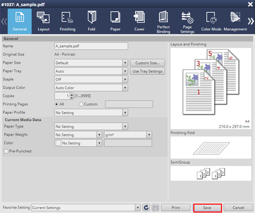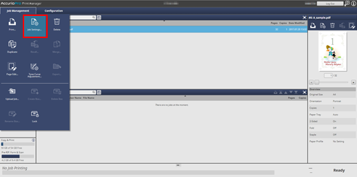 L'écran Job Edit (print setting) de AccurioPro Print Manager permet de procéder aux réglages suivants.