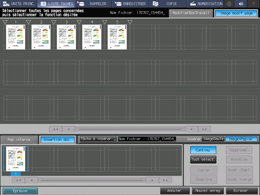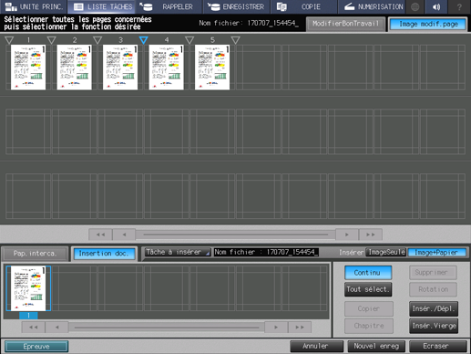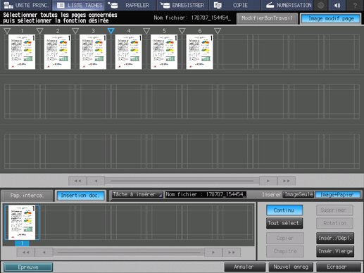 Dans le champ Insertion doc. en bas de l'écran, appuyez sur la/les pages à insérer.