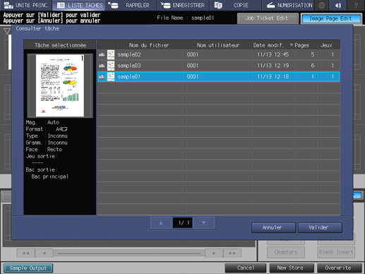 Explication supplémentaireSi la tâche contient 30 page ou plus, basculez l'affichage avec (précédent) / right (suivant) / (premier) / rightright (dernier) affichés au bas de l'écran d'aperçu.
