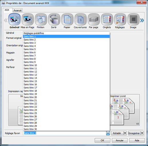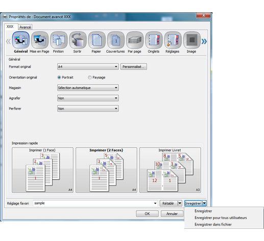 Vous pouvez configurer les paramètres d'impression sur plusieurs écrans de réglage et nommer chaque réglage pour enregistrer les informations. Vous pouvez rappeler à tout moment les paramètres d'impression enregistrés dans le menu déroulant. L'enregistrement des fonctions compliquées fréquemment utilisées vous évite de répéter à chaque fois les étapes de configuration, d'où son utilité.