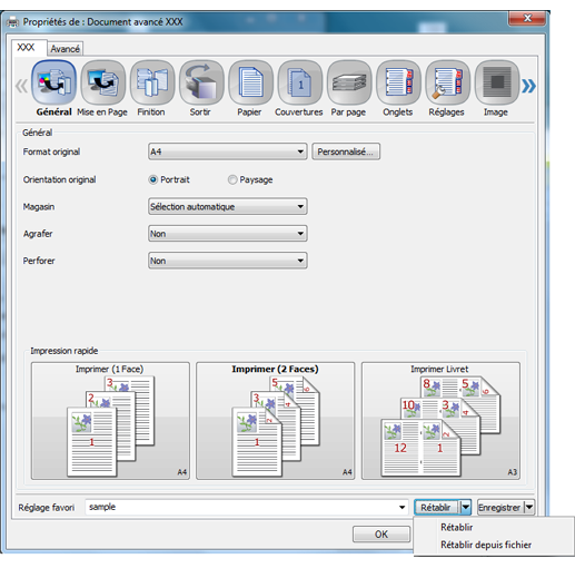 Cliquez sur l'onglet en haut de la page et configurez le réglage d'impression qui convient.