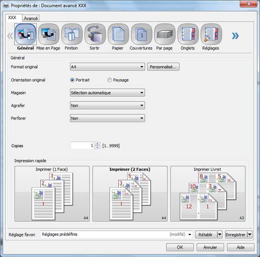 Réglage favori est disponible uniquement pour le pilote Plug-in PS et le pilote PCL. Général est disponible uniquement pour le pilote Plug-in PS et My Tab uniquement pour le pilote PCL. En revanche, elles ne sont pas disponibles dans les autres pilotes.