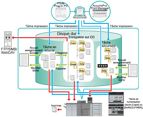 Vous pouvez enregistrer les données numérisées avec la machine (tâche numérisée sur l'écran COPIE et sur l'écran ENREGISTRER ainsi qu'une tâche d'impression d'un ordinateur en tant que tâche en attente ou tâche enregistrée sur disque dur.