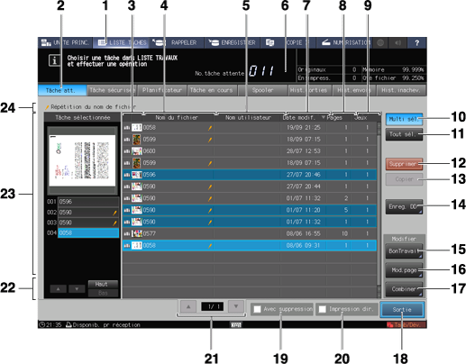 Affiche sous forme d'icône la première page d'une tâche en attente. Pour les tâches de copie et d'enregistrement créées par la machine, l'icône machine s'affiche à gauche de l'icône aperçu. L'icône machine n'est pas affichée pour les tâches d'impression envoyées par un ordinateur.