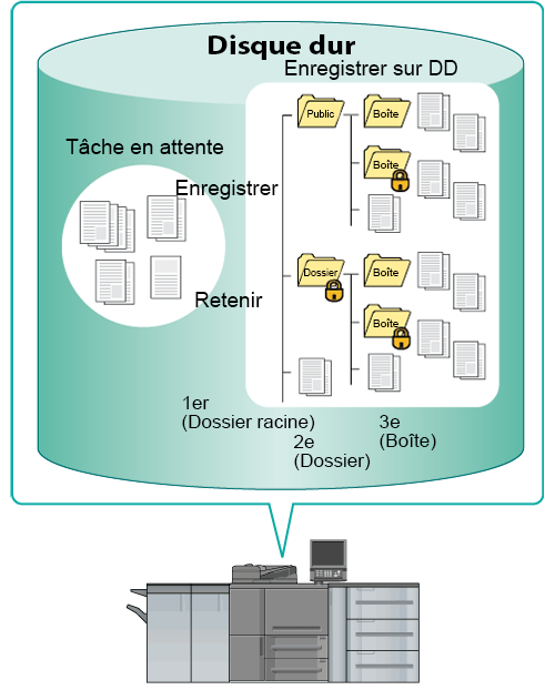 Vous pouvez enregistrer les données d'une tâche numérisées à l'aide de la machine et un travail d'impression d'un ordinateur en tant que tâche enregistrée sur disque dur.