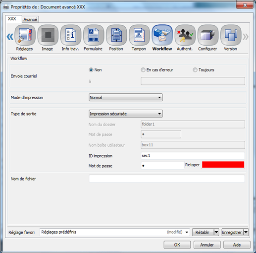 3. Cliquez sur l'onglet Workflow et sélectionnez Impression sécurisée dans le menu déroulant Type de sortie.