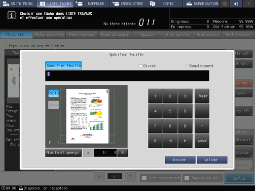 Sort la feuille spécifiée en mettant en attente les bons de travail existants. En spécifiant un Tampon/N° de page, vous réaffectez la feuille spécifiée.