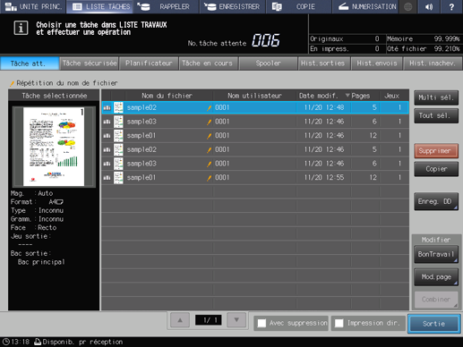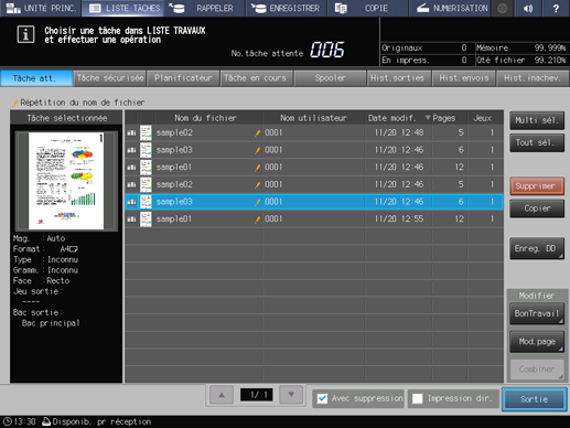 Explication supplémentaireL'écran Tâche en cours permet de gérer les tâches d'impression. Pour des détails, voir Écran Tâche en cours.