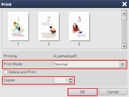 4. Sélectionnez Mode d'impression dans l'écran Imprimer, entrez le nombre de Copies, puis cliquez sur OK.