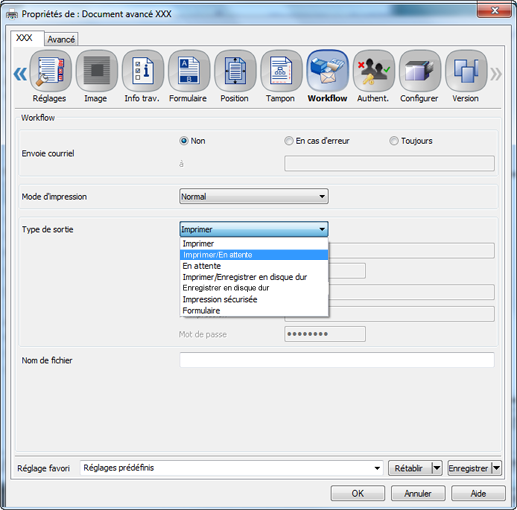 Dans le menu déroulant Méthode de sortie, sélectionnez Enregistrer sur disque dur, Enregistrer sur disque dur/Imprimer, Enregistrer sur disque dur/Imprimer(Épreuve), Enregistrer sur disque dur/Impr.(Épreuve/1ère) ou Enregistrer sur disque dur/Imprimer(Attendre).