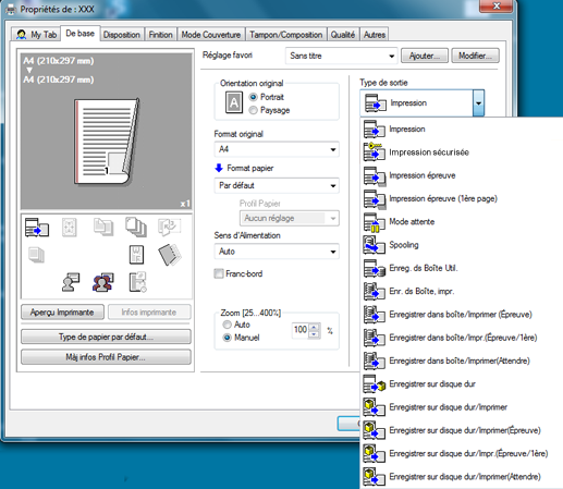 Explication supplémentairePour imprimer des données simultanément à la mise en attente d'une tâche d'impression sur la machine, sélectionnez Imprimer/Enregistrer en disque dur. Sélectionnez un mode d'impression dans le menu déroulant Mode d'impression.