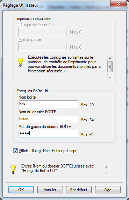 Explication supplémentairePour enregistrer un travail d'impression sur le disque dur, entrez le Nom de dossier et le Mot de passe que vous avez spécifiés sur l'écran RAPPELER de la machine. Pour enregistrer un travail d'impression dans la boîte du dossier, spécifiez Nom boîte.