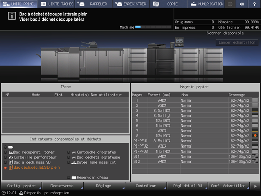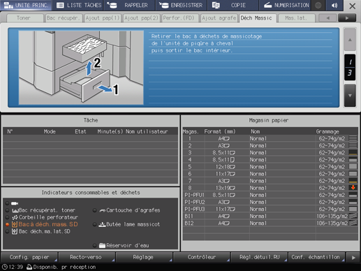 Appuyez sur l'indicateur Bac déch.déc.lat.SD plein dans la zone Indicateurs consommables et déchets de l'écran UNITÉ PRINC.