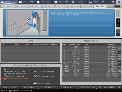 L'indicateur Bac à déch.déc.lat.SD plein dans la zone Indicateurs consommables et déchet de l'écran UNITÉ PRINC. s'allume en rouge et le texte est affiché en jaune.