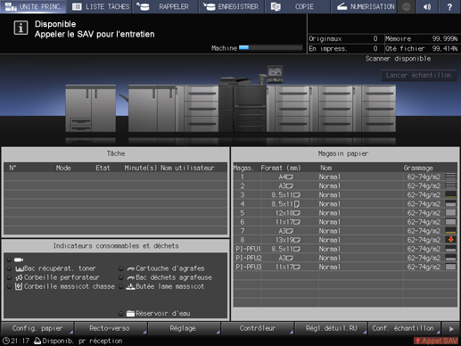 Lorsque l'icône Appel SAV apparaît dans la zone d'indicateurs d'état de la machine / à droite et lorsque le message suivant apparaît dans la zone de message de l'écran, contactez le technicien S.A.V. pour qu'il effectue un programme d'entretien périodique.