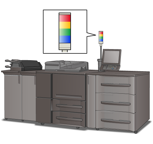 Aucun voyant | L'interrupteur principal ou l' interrupteur auxiliaire est sur arrêt. Sinon, la machine n'est pas prête à imprimer parce qu'elle est en préchauffage ou parce que la porte est encore ouverte. | Si le voyant ne s'éclaire pas pour d'autres raisons que celles indiquées ci-contre, vérifiez le message sur le panneau de contrôle. |