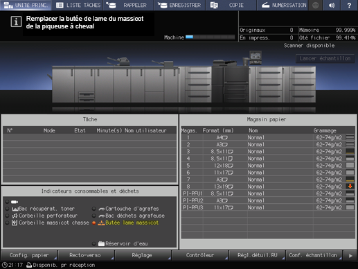 L'indicateur Butée lame massicot dans la zone Indicateurs consommables et déchets de l'écran UNITÉ PRINC. s'allume en rouge et la couleur du texte devient jaune.