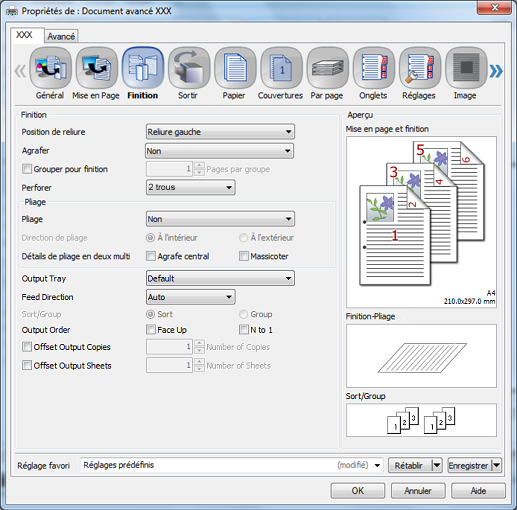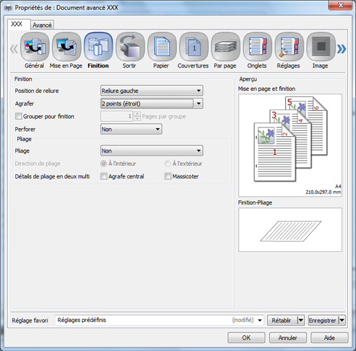 Lors de la configuration du pilote d'imprimante, assurez-vous d'avoir supprimé les réglages précédents des différents éléments des onglets Mise en Page, Finition, Couvertures, etc.